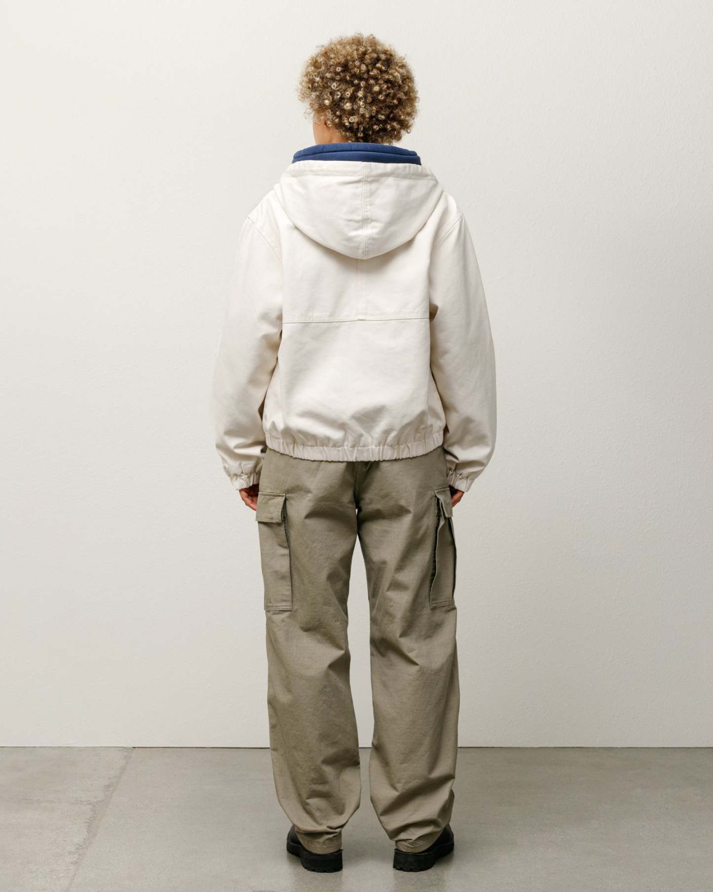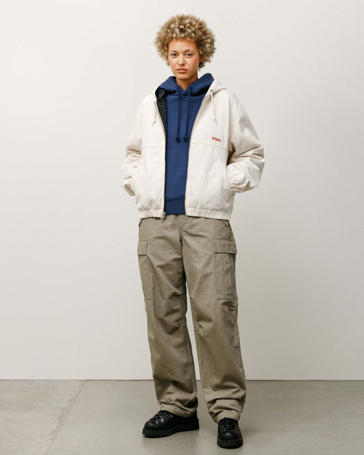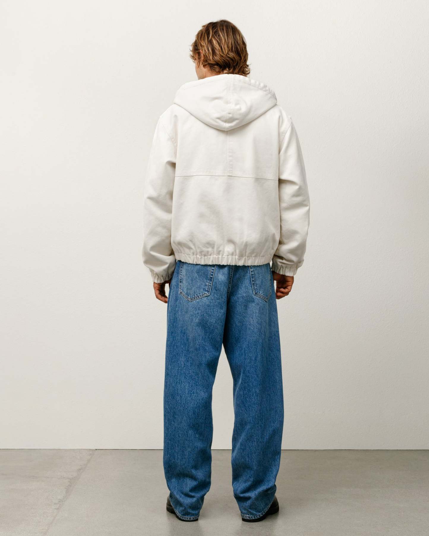 Features a front zip closure, welt pockets, and Stüssy workgear embroidery at the chest