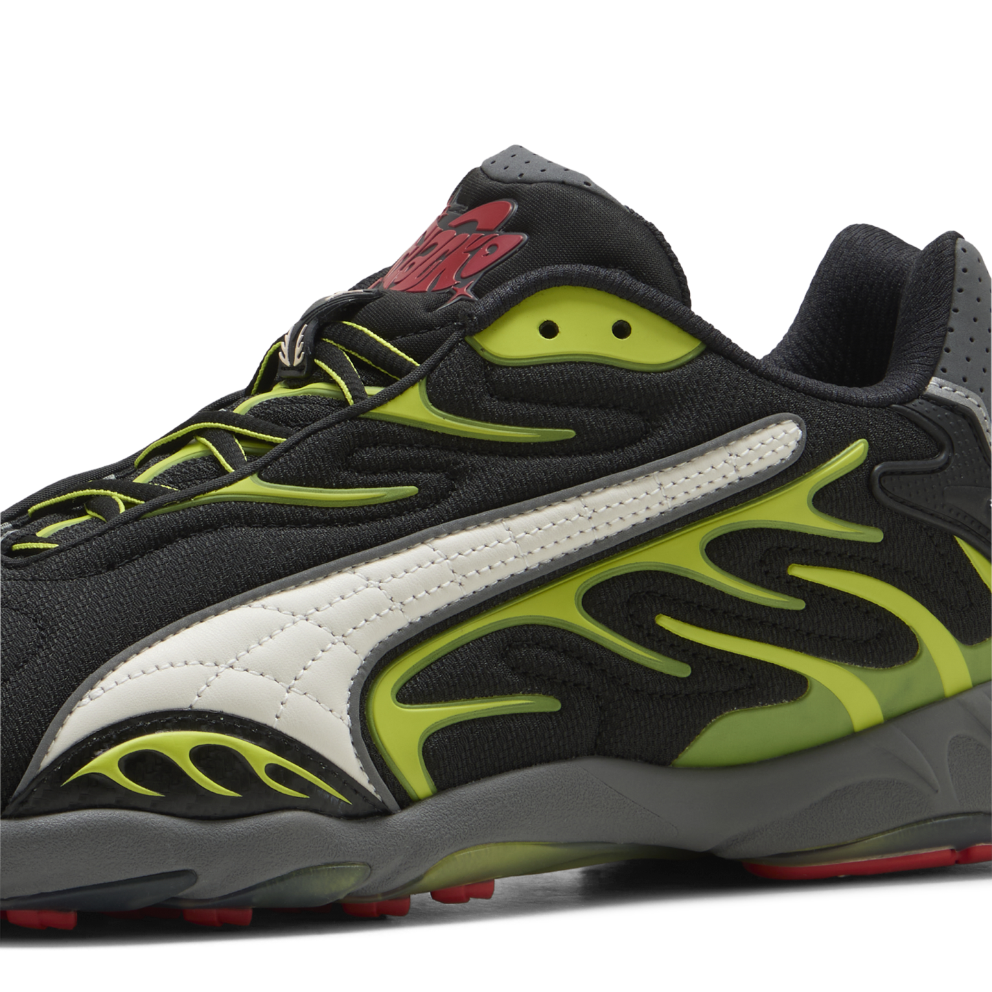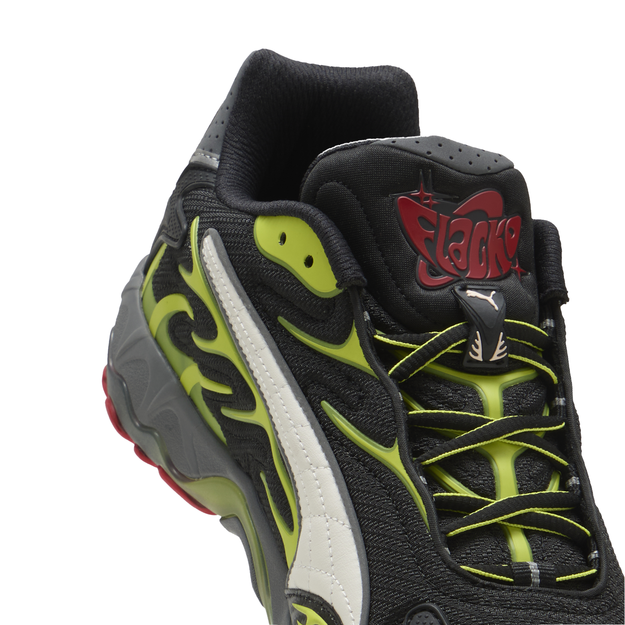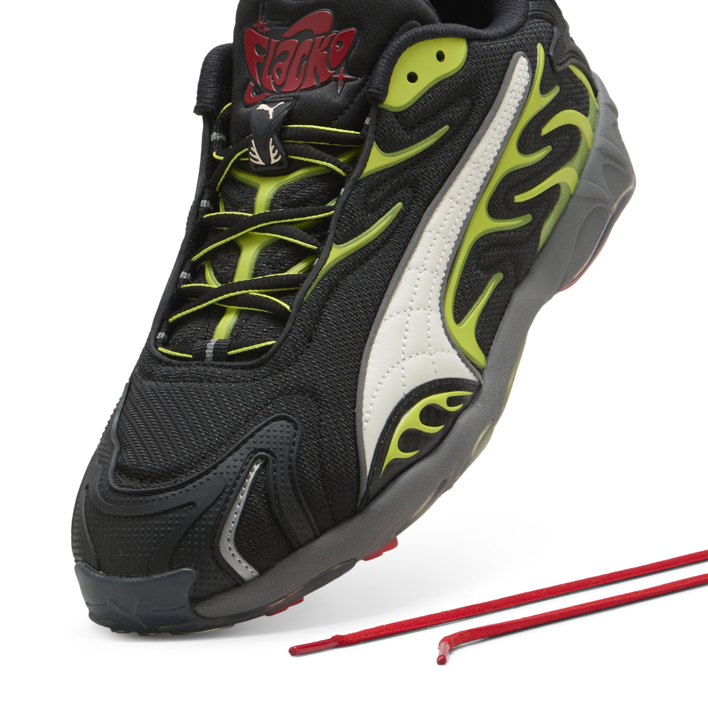 A$AP Rocky puts his own spin on the Puthtma Inhale. The progressive streetwear staple is re-engineered with a mesh upper, heat cut flames surrounding the Formstrip, and a translucent gradient sole. Reflective detailing, a FLACKO logo on the tongue, and a printed custom footbed round off this track-to-street icon.