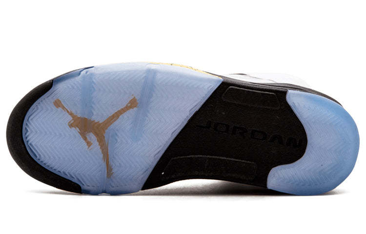 The Air Jordan 5 Retro 'Olympic' will have you feeling like a champion. This sneaker celebrates the 2016 Summer Olympics in Rio and features a white leather upper with black and gold accents. The Ice Blue translucent outsole is inspired by the medal podium and is sure to turn heads. This release also comes with a Metallic Gold tongue, a nod to the first place medals handed out at the games. Whether you're lacing them up for a game or just hitting the streets, the Air Jordan 5 Retro 'Olympic' will have you feeling like a winner.