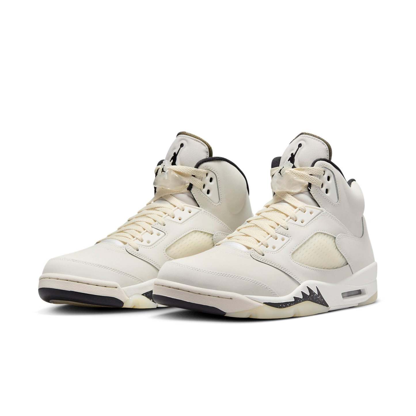 The Air Jordan 5 'Sail', exudes elegance and style. Although official images are yet to surface, this sneaker boasts a sophisticated color palette, combining sail, black, light orewood brown, and coconut milk hues. The premium build features a sail base with coconut milk accents on the translucent netting found on the panels and tongues, as well as the outsole. Black and light orewood brown details grace the Jumpman logo, inner liner, and midsole.