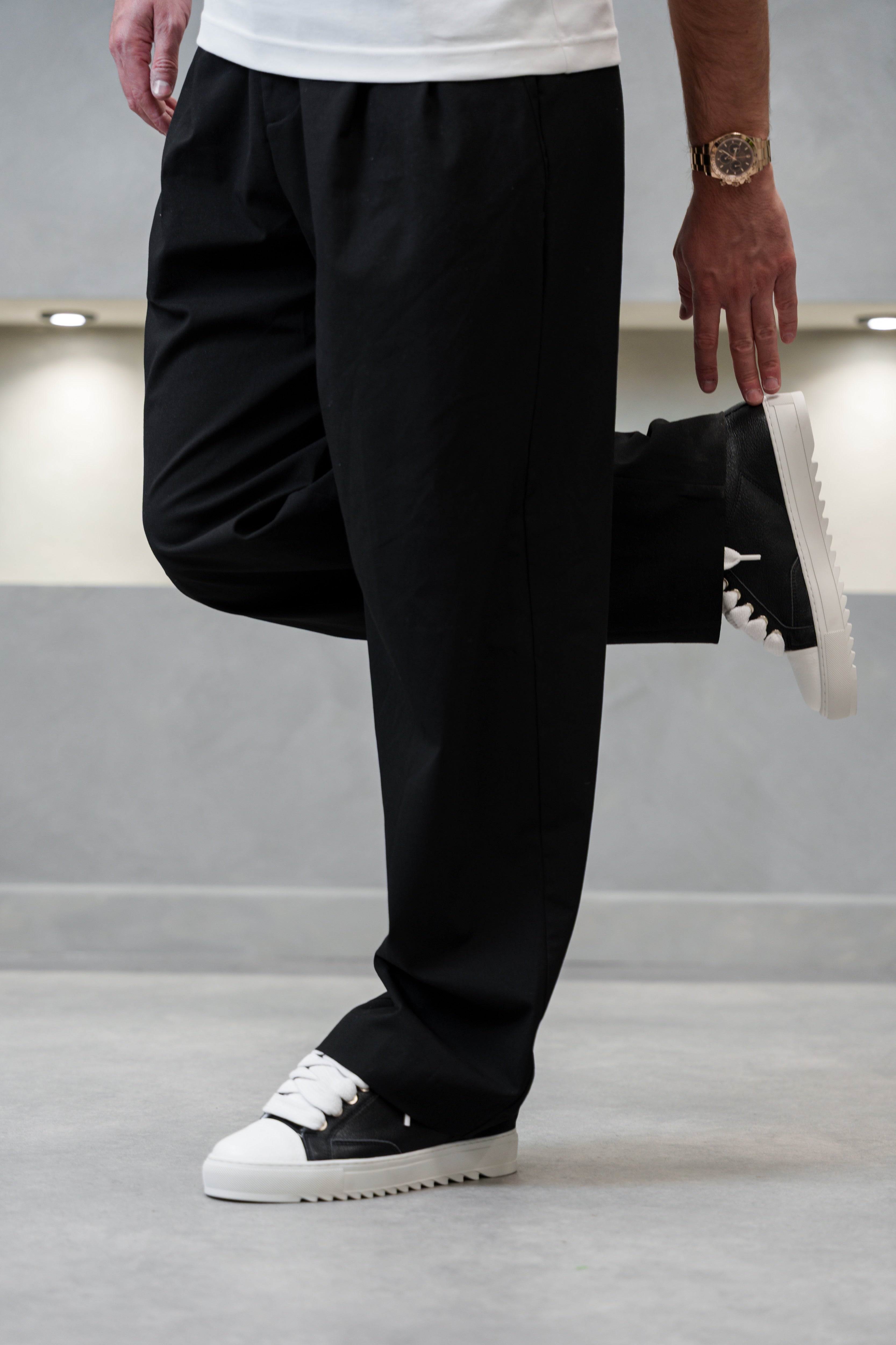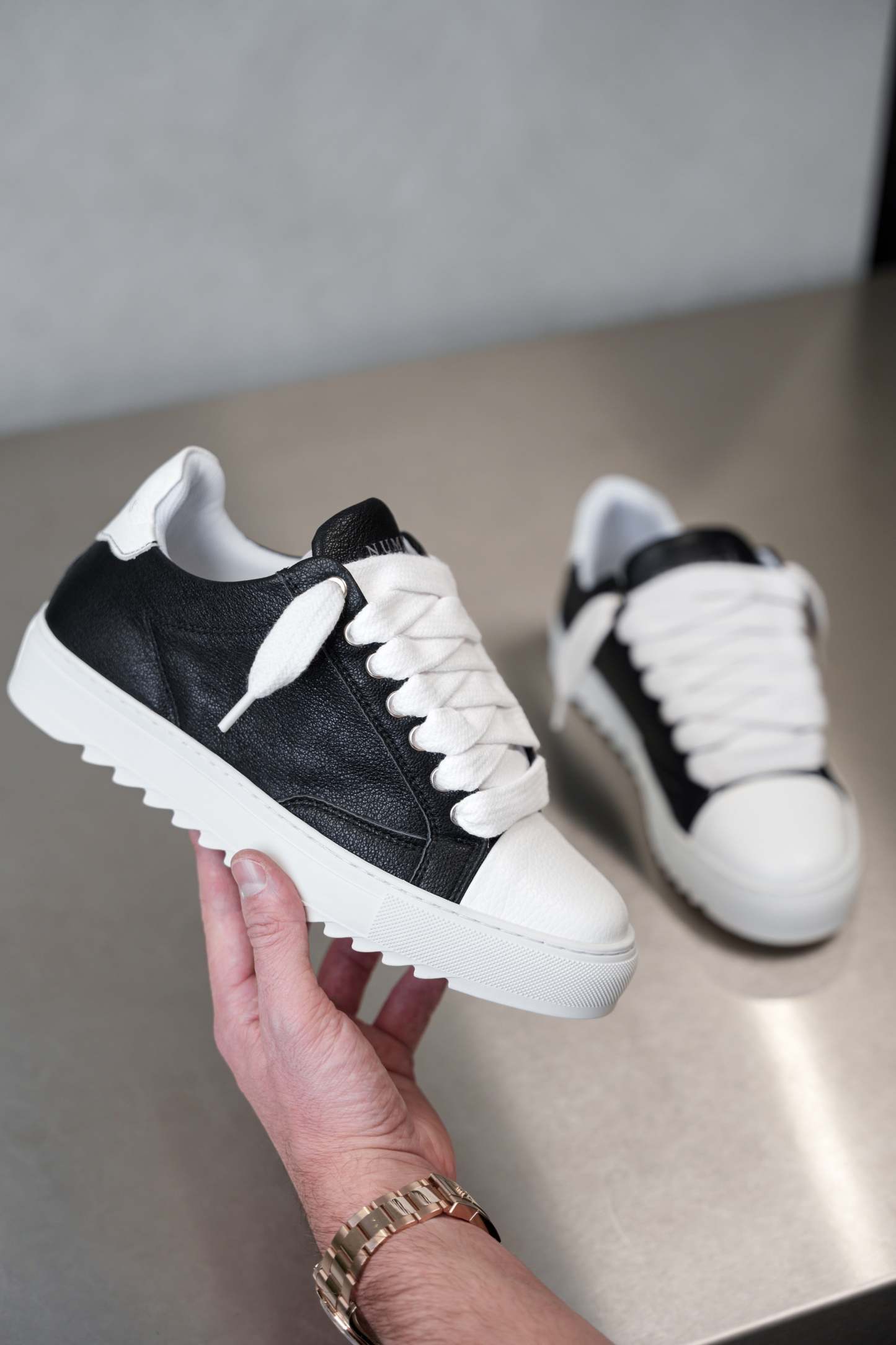 The Atelier trainer was inspired by Parisian lifestyle. Every stitch and detail was meticulously designed in a Parisian workshop. This Atelier features a full premium black Italian leather upper with crisp white stitching and finished with our signature pebbled leather white toe cap. The interior of the trainer features collar lining providing unrivalled comfort. The final touches see our Numeriś branding on the heel and tongue of the shoe.