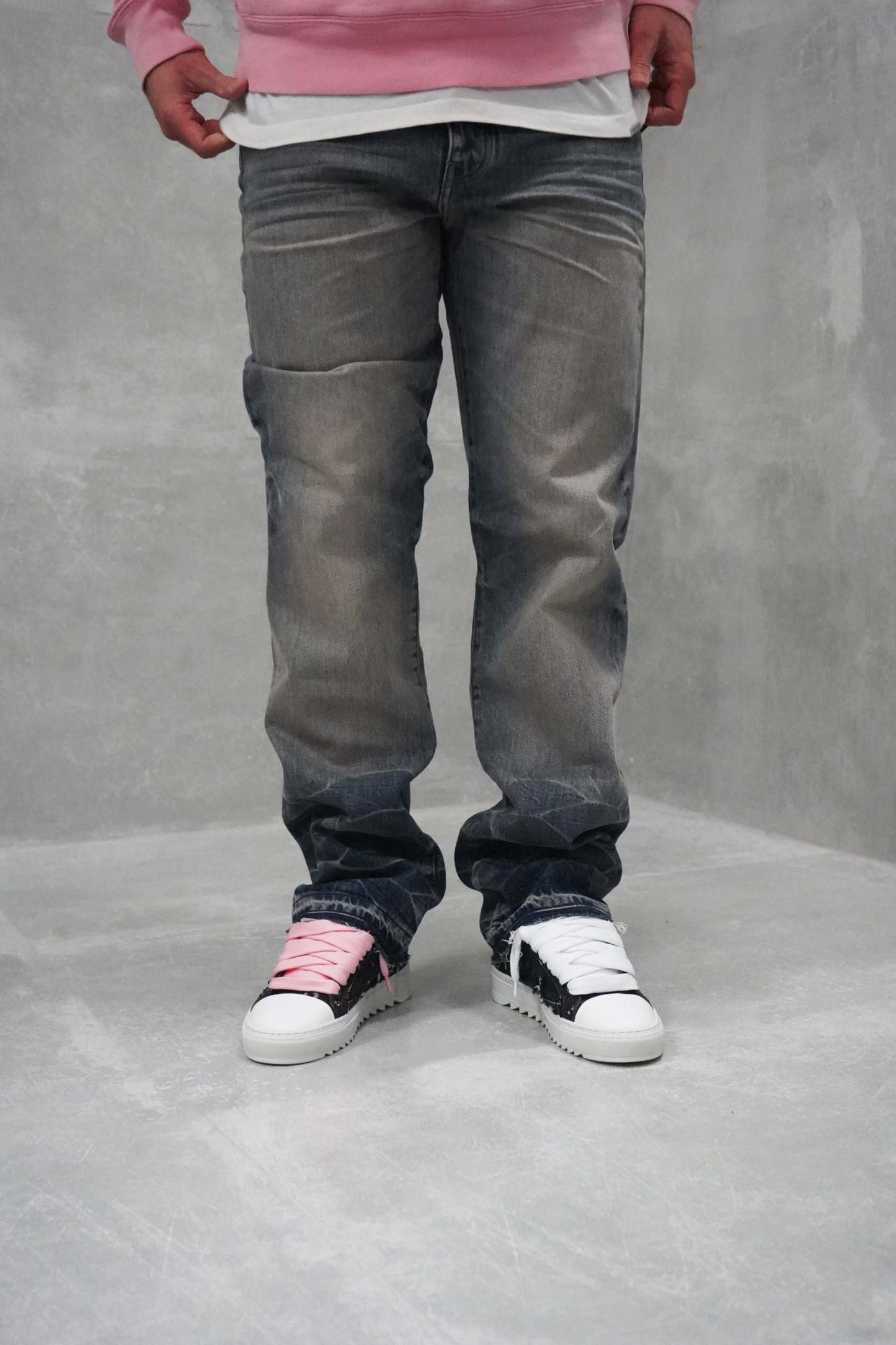 - Hand distressed denim.