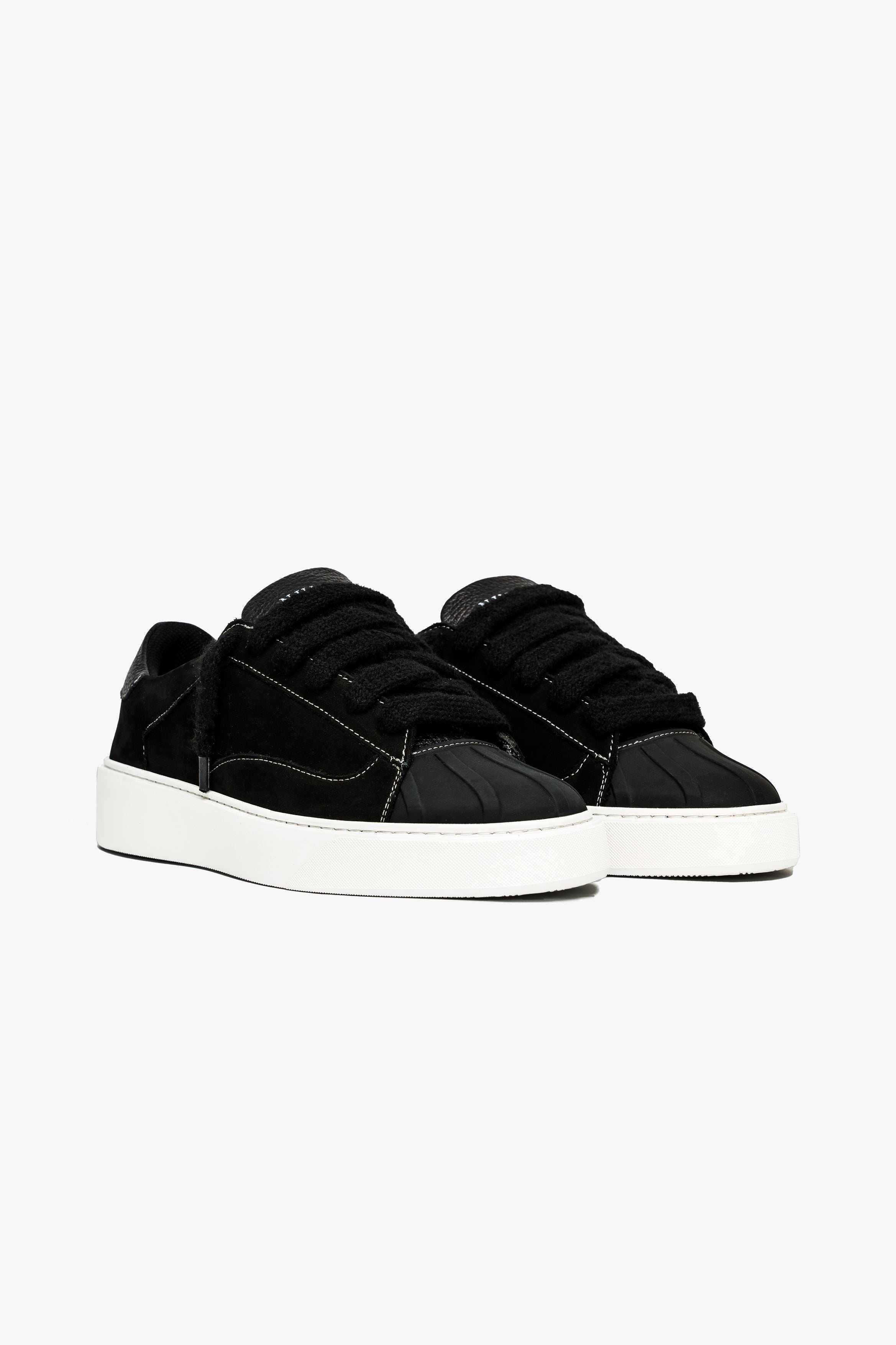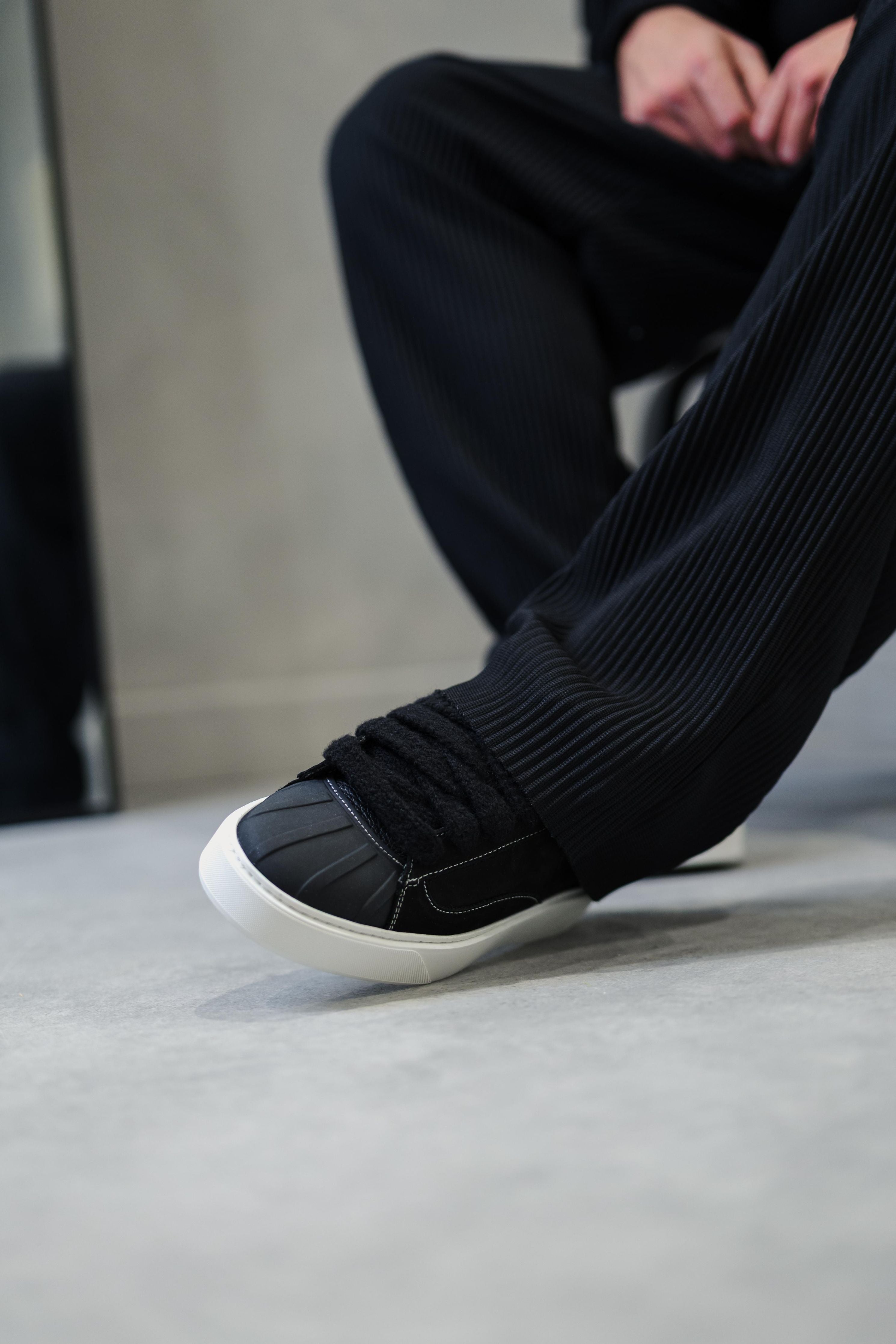 Introducing the Eclipse. Drawing quiet influence from the pared-back forms of 1960s basketball footwear, reinterpreted through a modern, sculptural lens. Its defining element, the hand-shaped rubber shell toe, has been meticulously developed over months to achieve a silhouette that balances structure with design. Designed to sit seamlessly within the flow of the upper, its curves and ridges were shaped through countless iterations to achieve a form that feels both modern and rooted in heritage.
