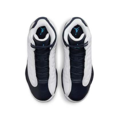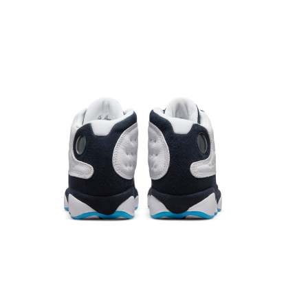 Looking for a shoe that will help you take your game to the next level? Check out the Air Jordan 13 Retro GS! Offered in grade school sizing, this sneaker is perfect for young athletes who need a little extra support on the court. The white leather upper is accented with navy blue leather and suede paneling, making for a classic and timeless look. The holographic cat eye on the lateral collar is a signature detail of the Air Jordan 13, and the panther paw outsole provides superior traction and grip.