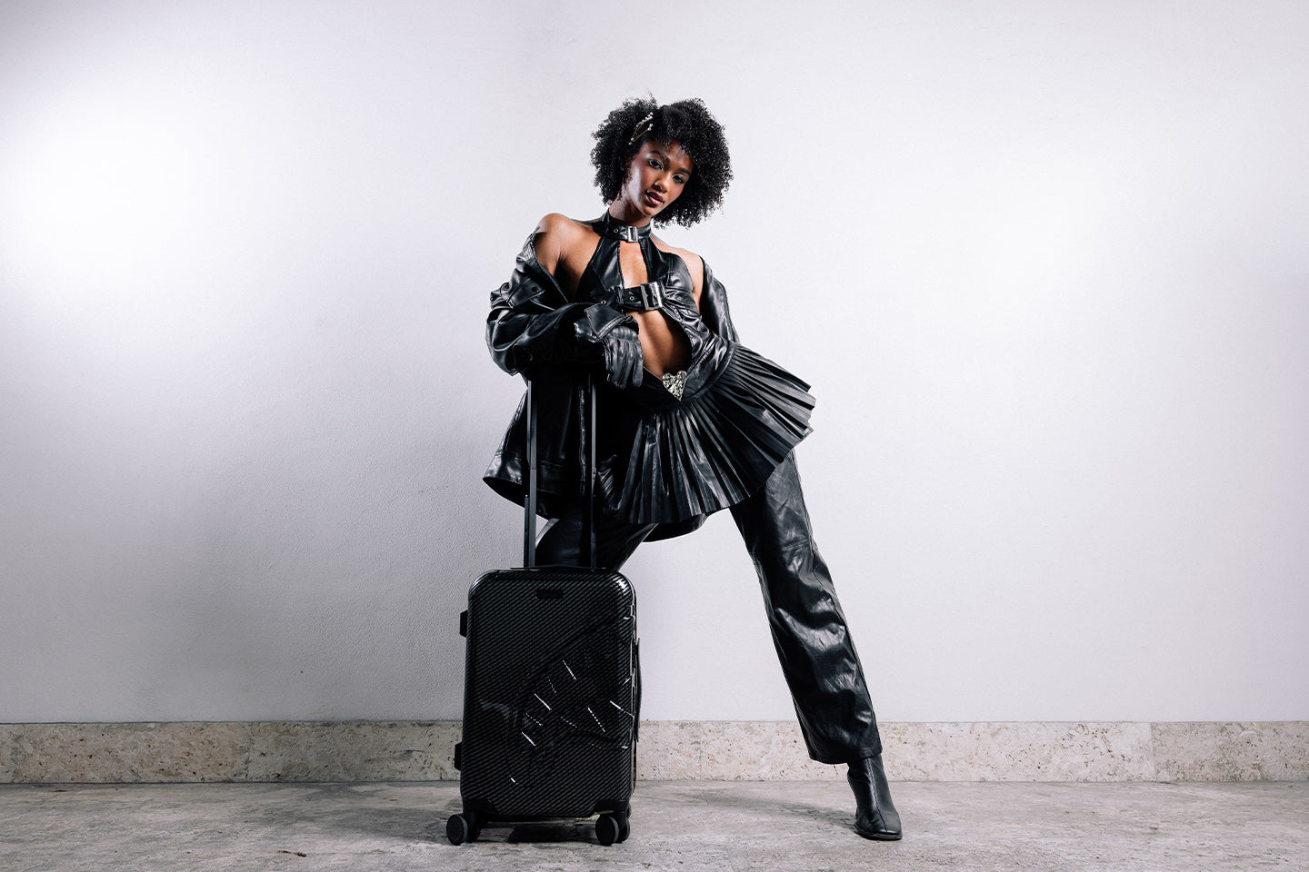 Faux carbon fiber DLX with PVC grain embossed sharmouth, wheels for traveling, bottom of straps can be unhooked to keep clean while rolling, easy zippered compartment for handle storage, suitcase handle sleeve, padded laptop compartment, interior mesh zipper, flat base, embossed zipper pulls, whip stitch luggage tag