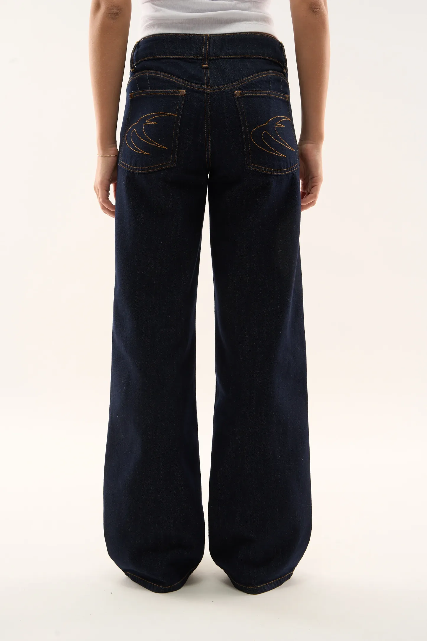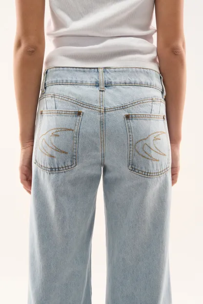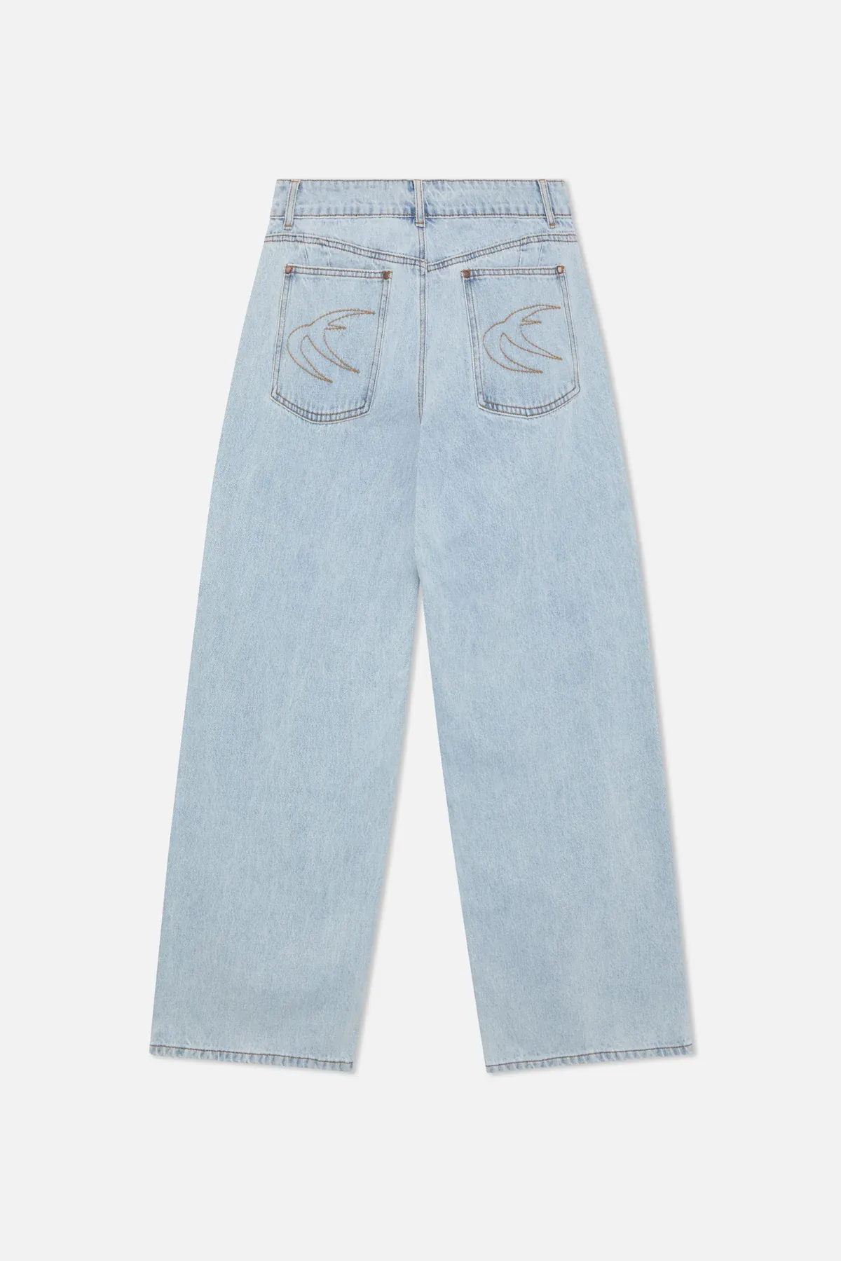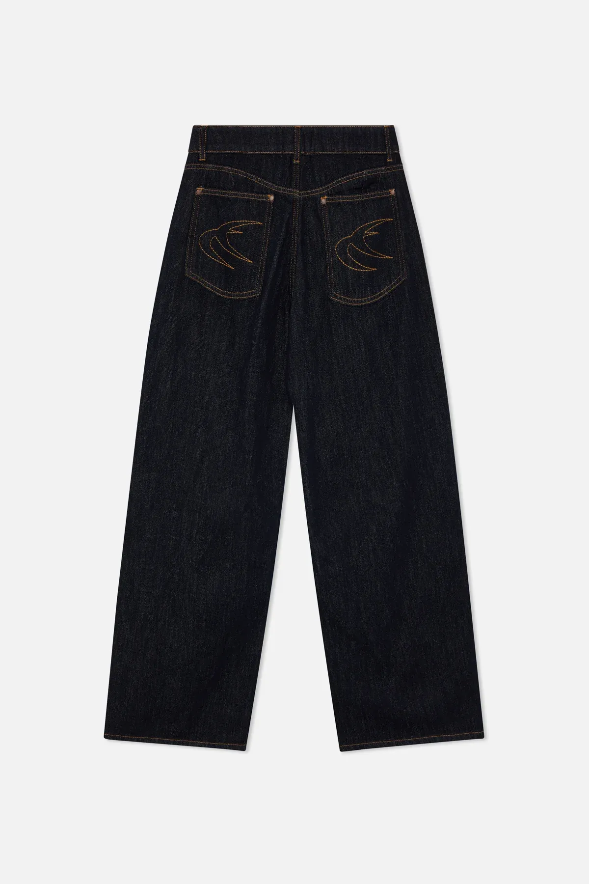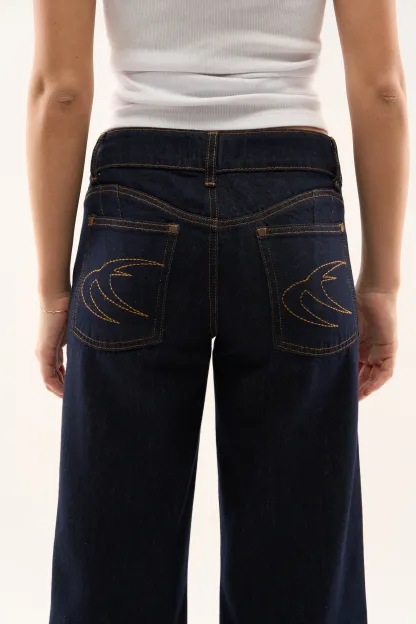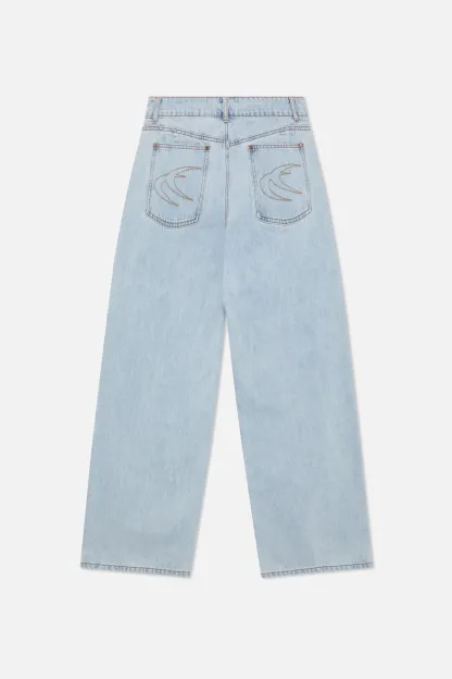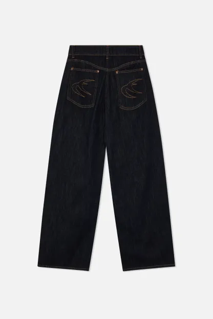 Wash Wide-Leg Jeans made from rigid cotton denim, featuring a relaxed fit with a mid-rise waist. Designed with clean legs and contrast stitching, finished with embroidered on the back pockets.