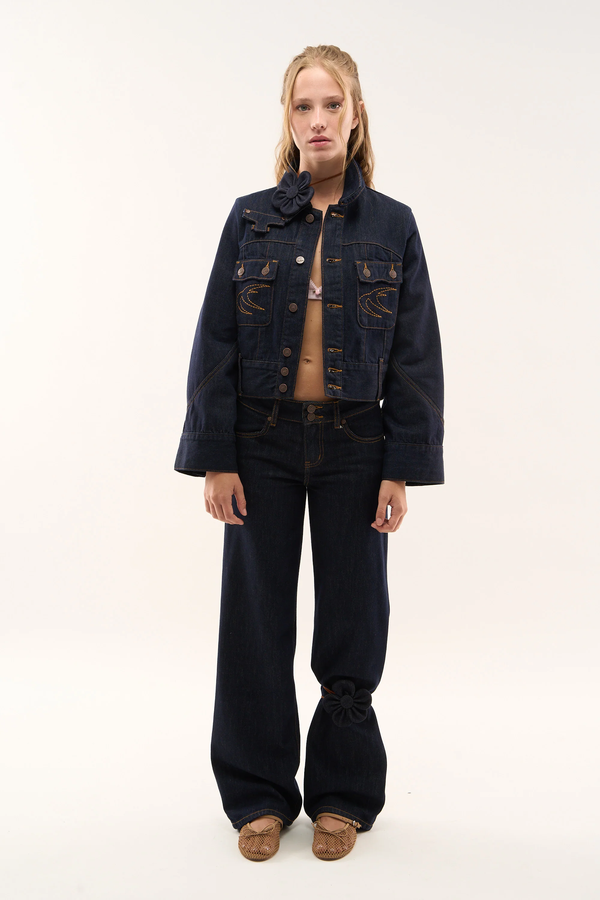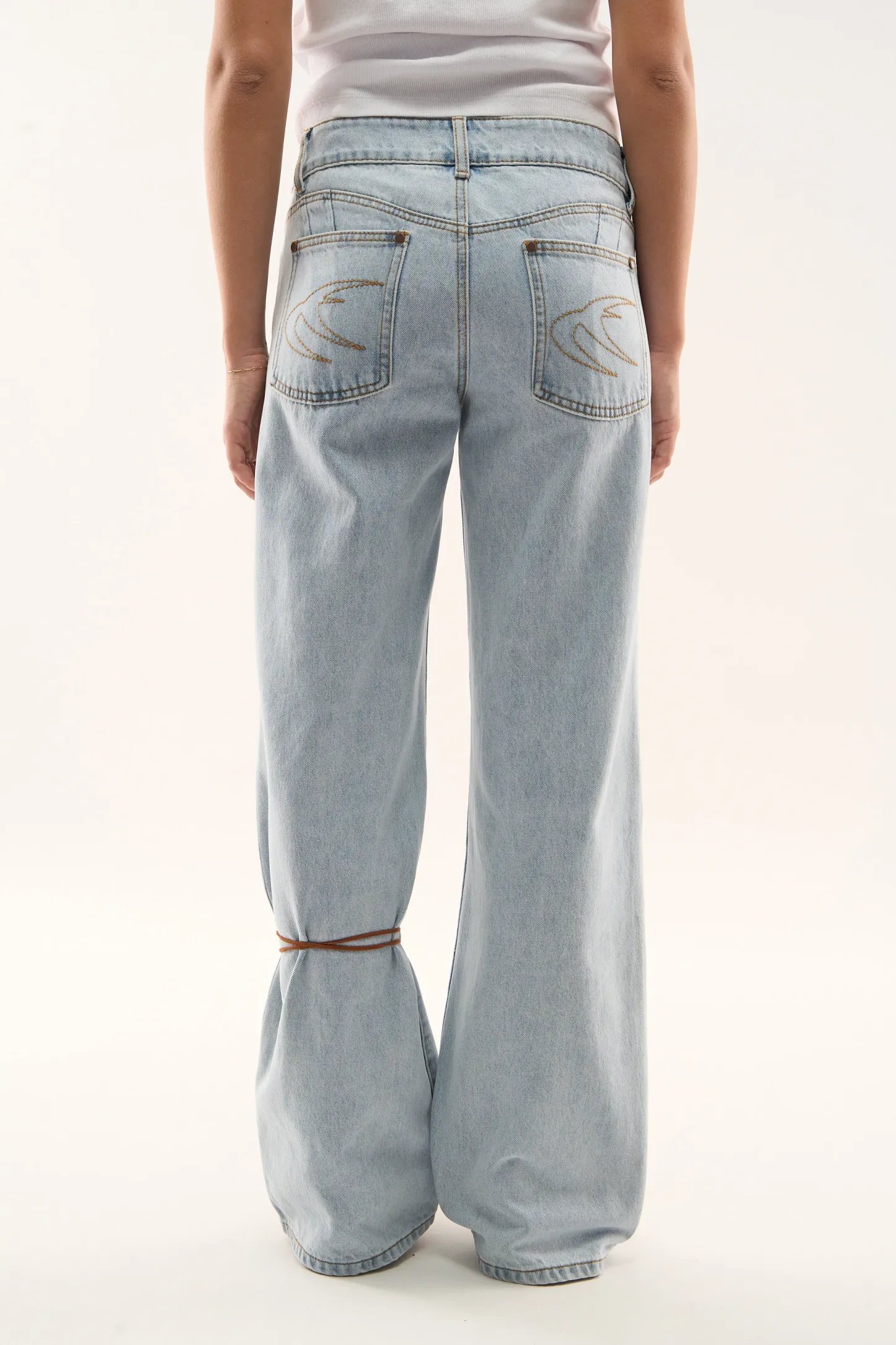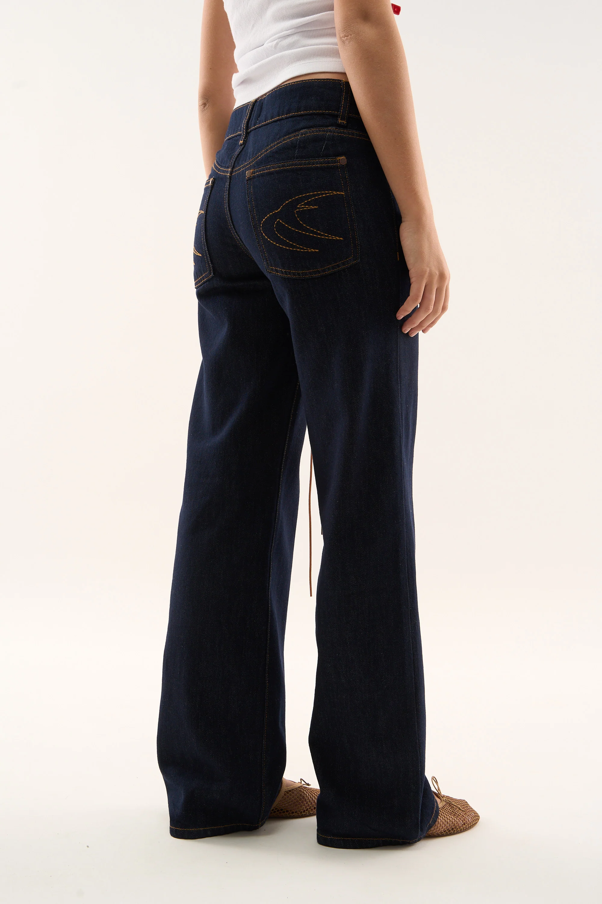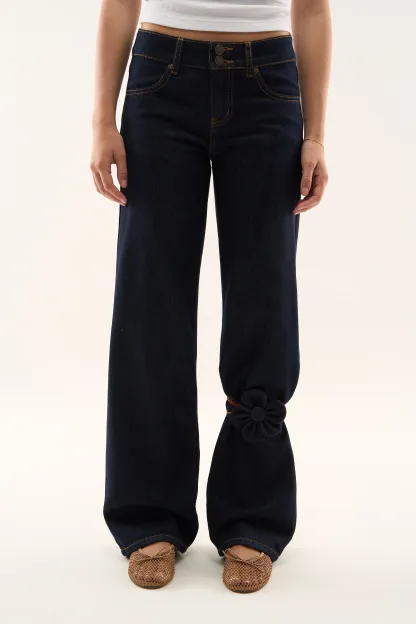 Wash Wide-Leg Jeans made from rigid cotton denim, featuring a relaxed fit with a mid-rise waist. Designed with clean legs and contrast stitching, finished with embroidered on the back pockets.