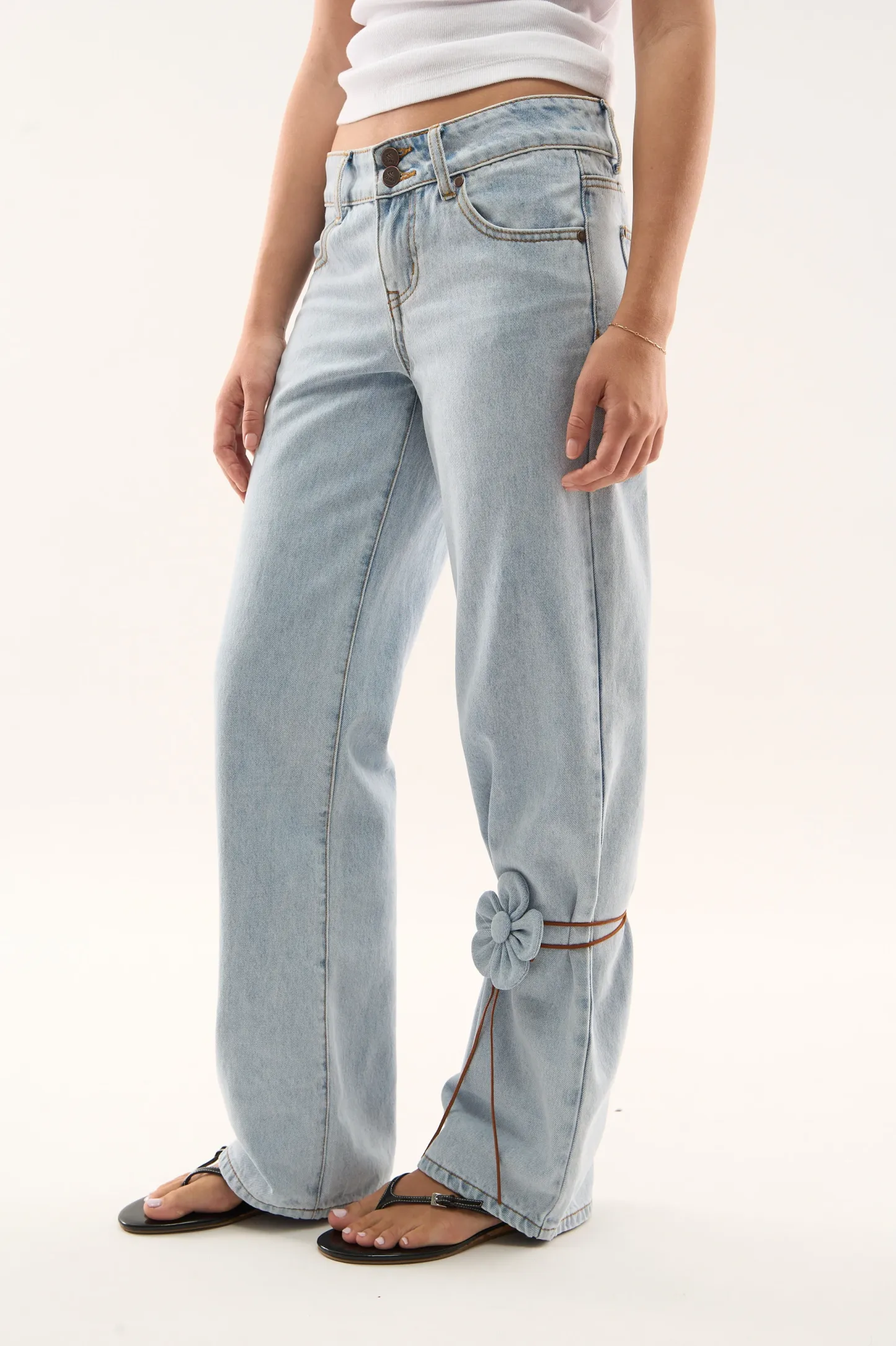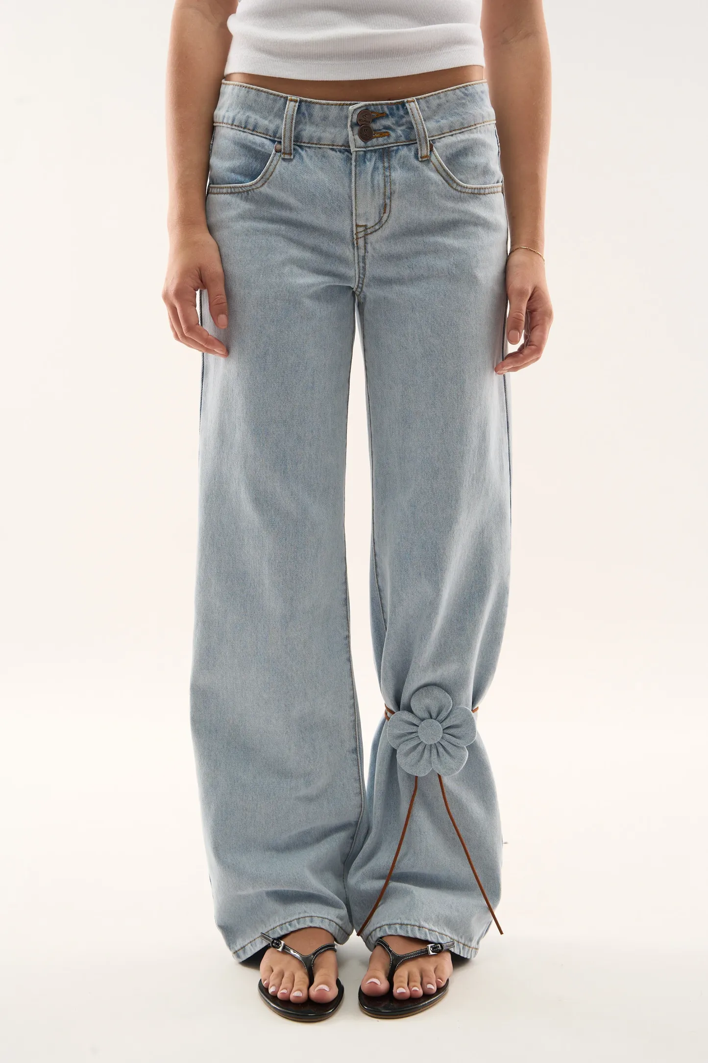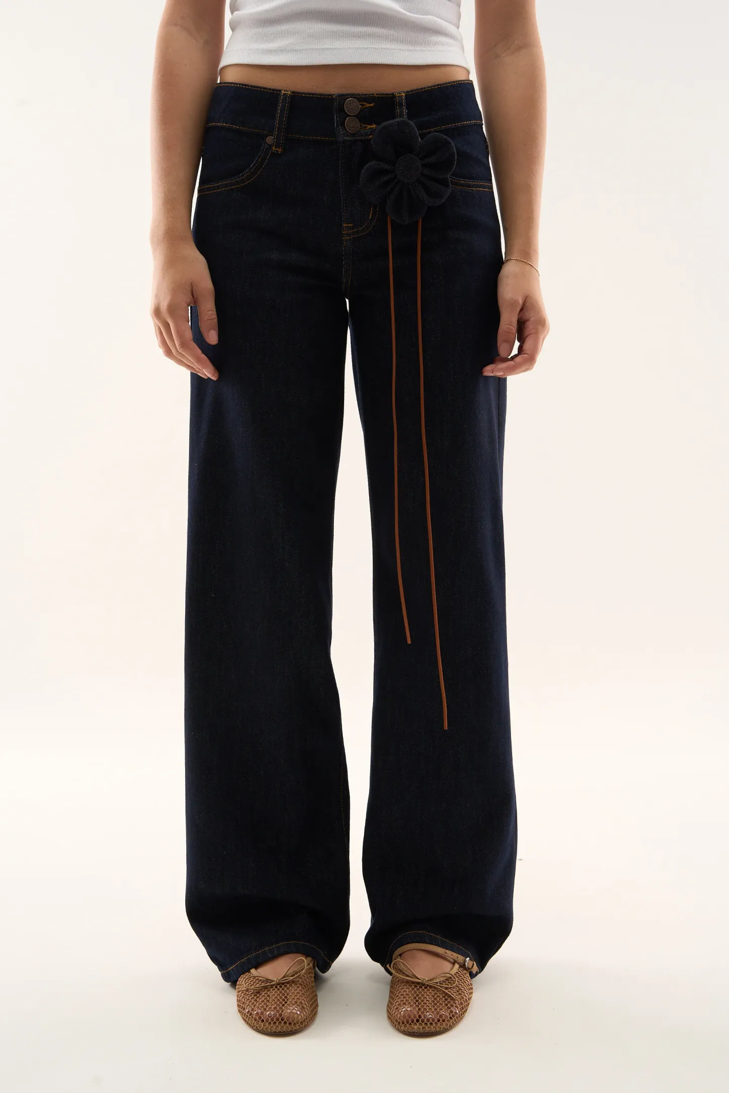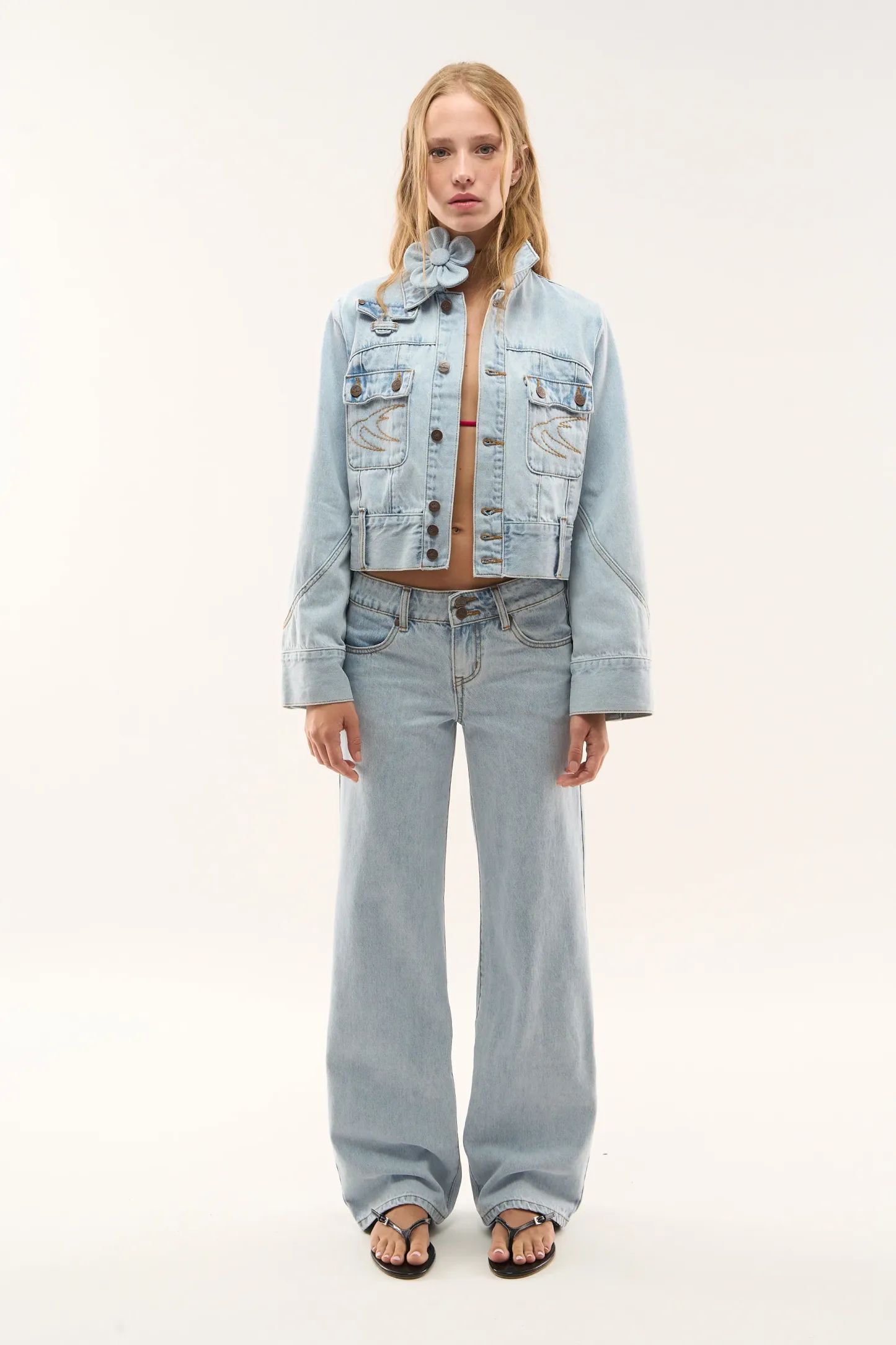 Wash Wide-Leg Jeans made from rigid cotton denim, featuring a relaxed fit with a mid-rise waist. Designed with clean legs and contrast stitching, finished with embroidered on the back pockets.