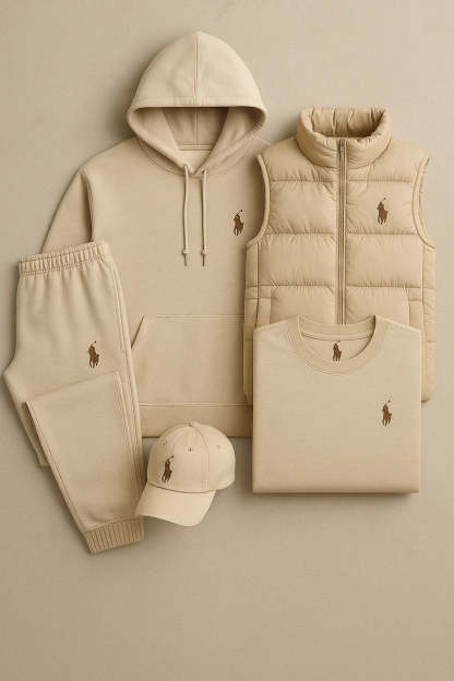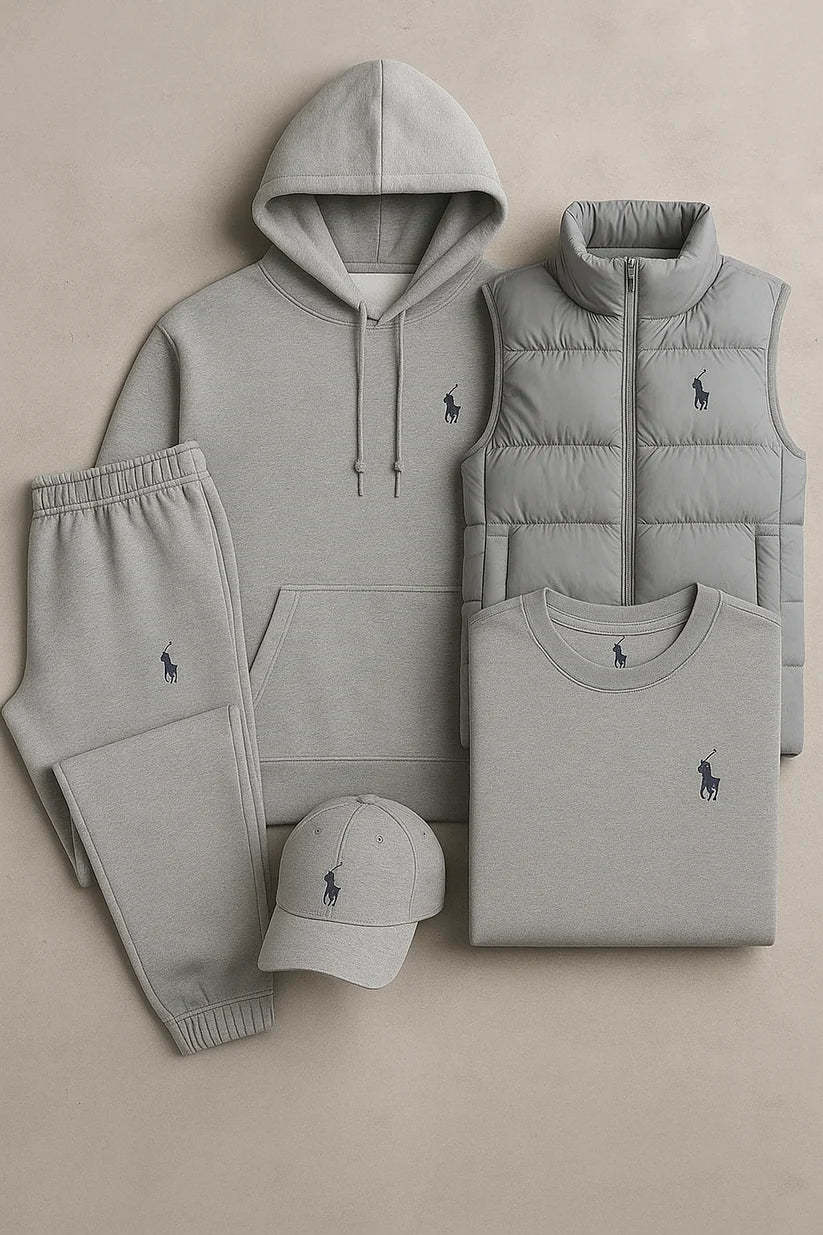 Discover the RL™ Grey Essentials Set, an exclusive selection of iconic pieces designed to combine style, comfort, and versatility. The set includes a hoodie, joggers, padded vest, long-sleeve T-shirt, and cap, all crafted in an elegant grey mélange and finished with the signature embroidered Polo logo. Soft, durable, and perfect for both everyday casual wear and relaxed moments, each item delivers the refined quality that defines the brand.